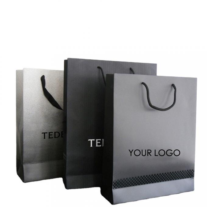 UV Luxury Black Gift Paper Bag Custom Made Dicetak Logo Kemasan Perhiasan Kraft Shopping Paper Bag Dengan Ribbon Strings Handles